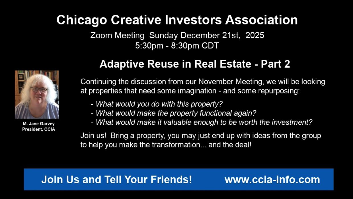 At this meeting we will be looking at properties that need some imagination, and some repurposing. "What would you do with this?" will be the question of the day. What would you need to make the property functional again? What would make it valuable enough to be worth the investment?